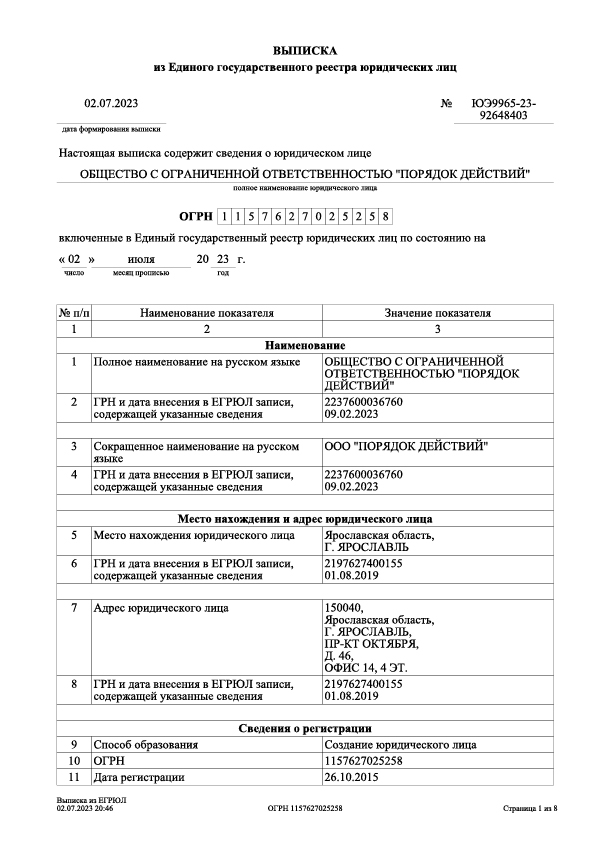 https://egrul.nalog.ru/index.html Факты о юридической компании ООО "Порядок действий"